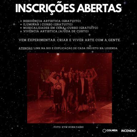 Integrando a programação do projeto Aumentar É Aumentar-se, o Teatro do Incêndio e a Colmeia Produções abrem inscrições (gratuitas) para atividades formativas, vivência e residência artística, no período de 4 a 28 de julho de 2025. Os interessados devem preencher formulário disponível na Bio da página @teatrodoincendiooficial, no Instagram. As listas com os nomes dos selecionados serão divulgadas no mesmo local, em 29/7/2025.