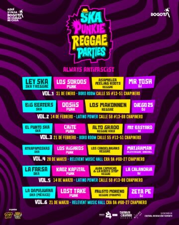 Com seis datas, mais de vinte projetos no palco e mais de cem músicos envolvidos, o Ska Punkie Reggae Parties 2026 se consolida como um dos circuitos mais relevantes do primeiro semestre do ano em Bogotá, reafirmando a força da música independente como ferramenta de encontro, resistência e cultura viva.