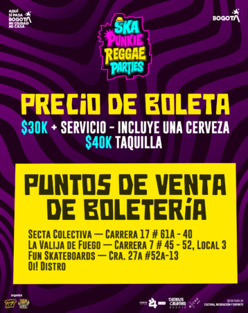 O Ska Punkie Reggae Parties 2026 é uma iniciativa liderada pela banda El Punto Ska, vencedora da Beca LEP Rutas Culturales 24/7 da Secretaria de Cultura, Recreação e Esporte (SCRD). Além da trajetória artística, o grupo acumula experiência sólida como produtor cultural, sendo responsável por projetos como o Ska Para Todos Fest e o El Concierskazo Fest, cuja próxima edição acontece no dia 1º de março de 2026, no Teatro ao Ar Livre La Media Torta.